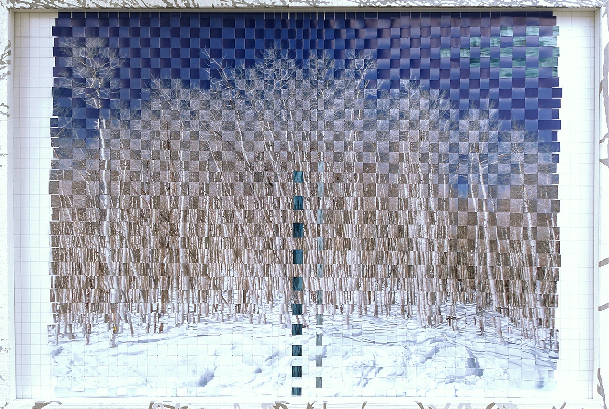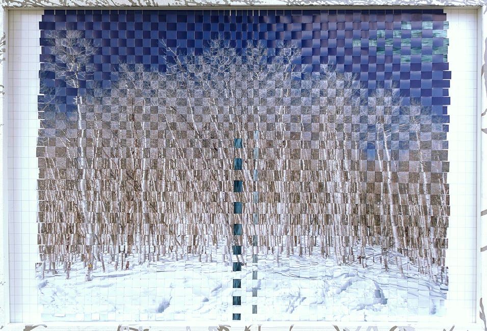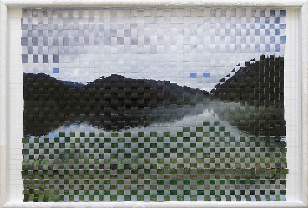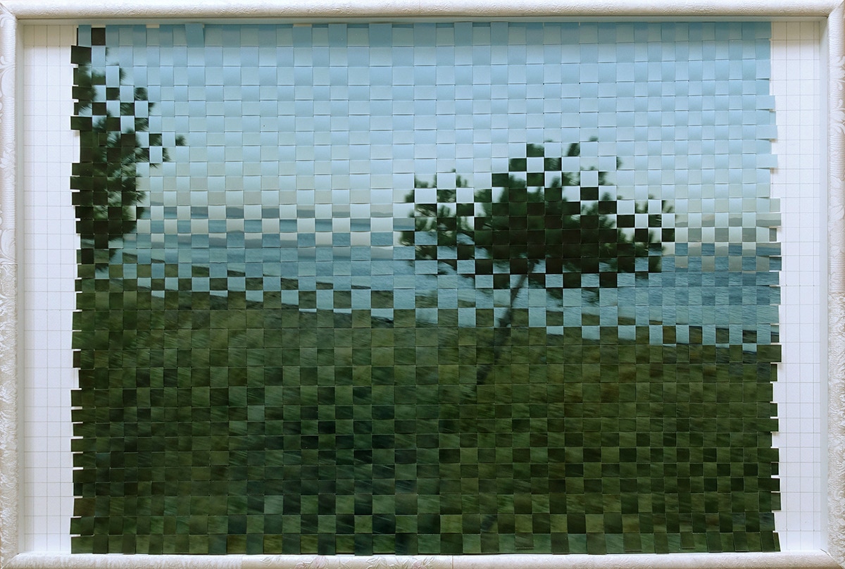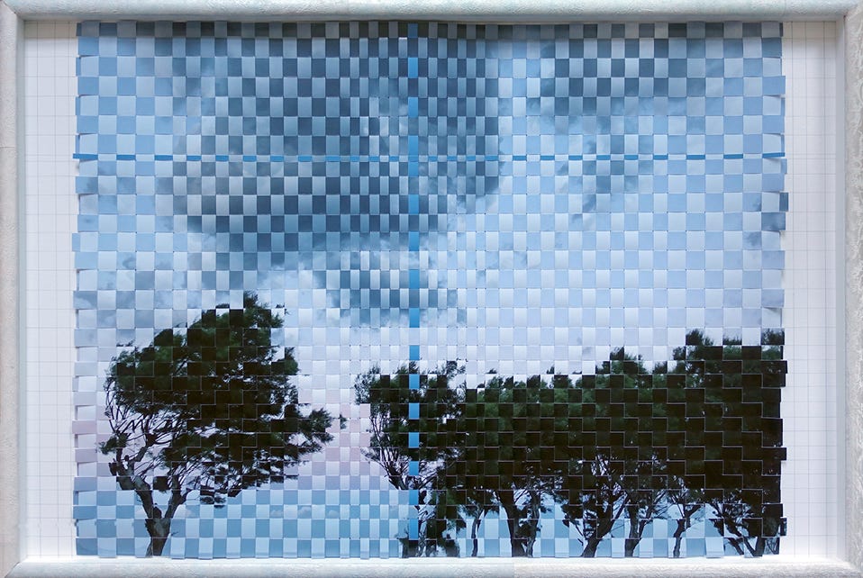 Woven photo picture; pencil, wallpaper on frame, 63,5 x 94 cm